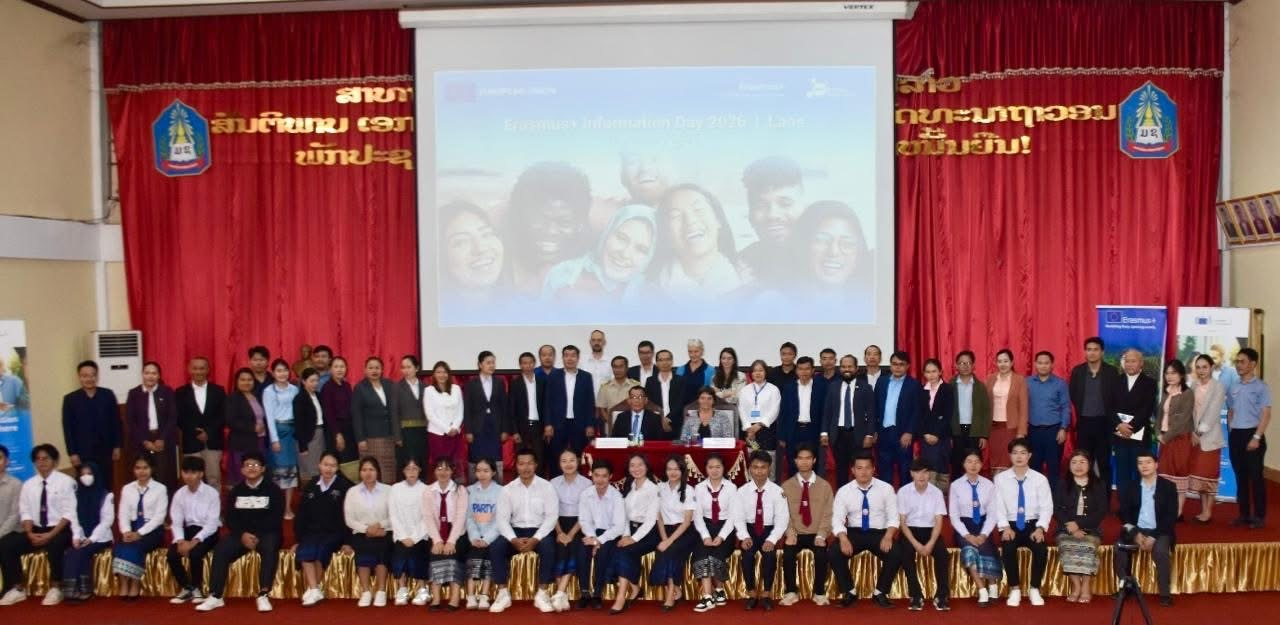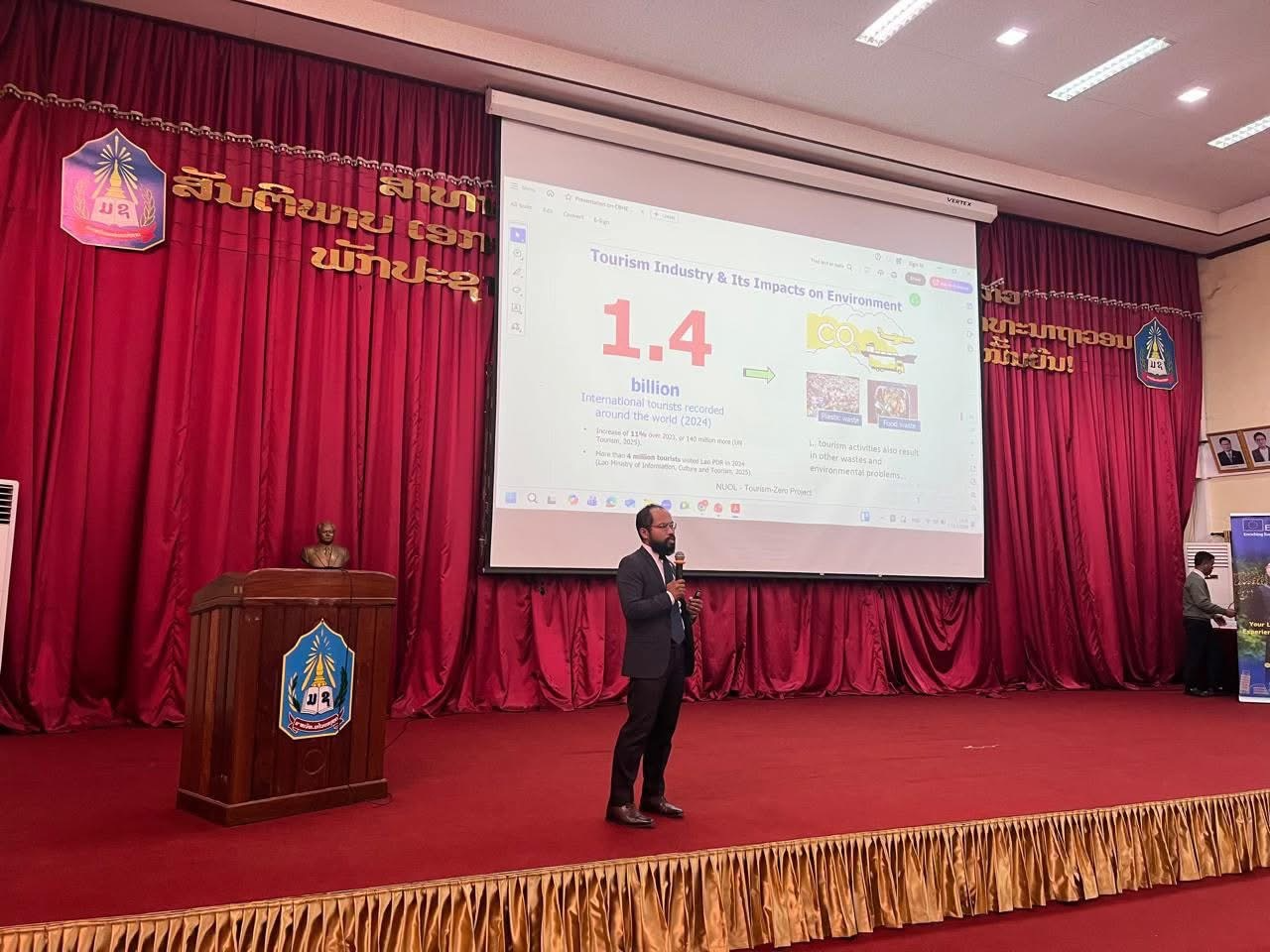 The NUOL Tourism-Zero team recently took the stage at the 2026 Erasmus+ Information Day in Laos to share our vision for a greener future in the tourism and hospitality industry. At the event, over 100 participants attended, ranging from students and academics to representatives from the EU Delegation Office, the Ministry of Education and Sports, and various NGOs.